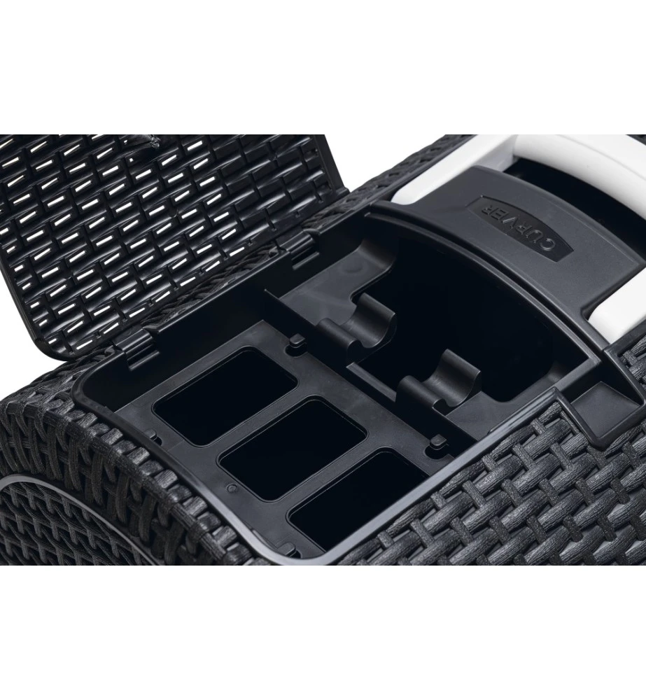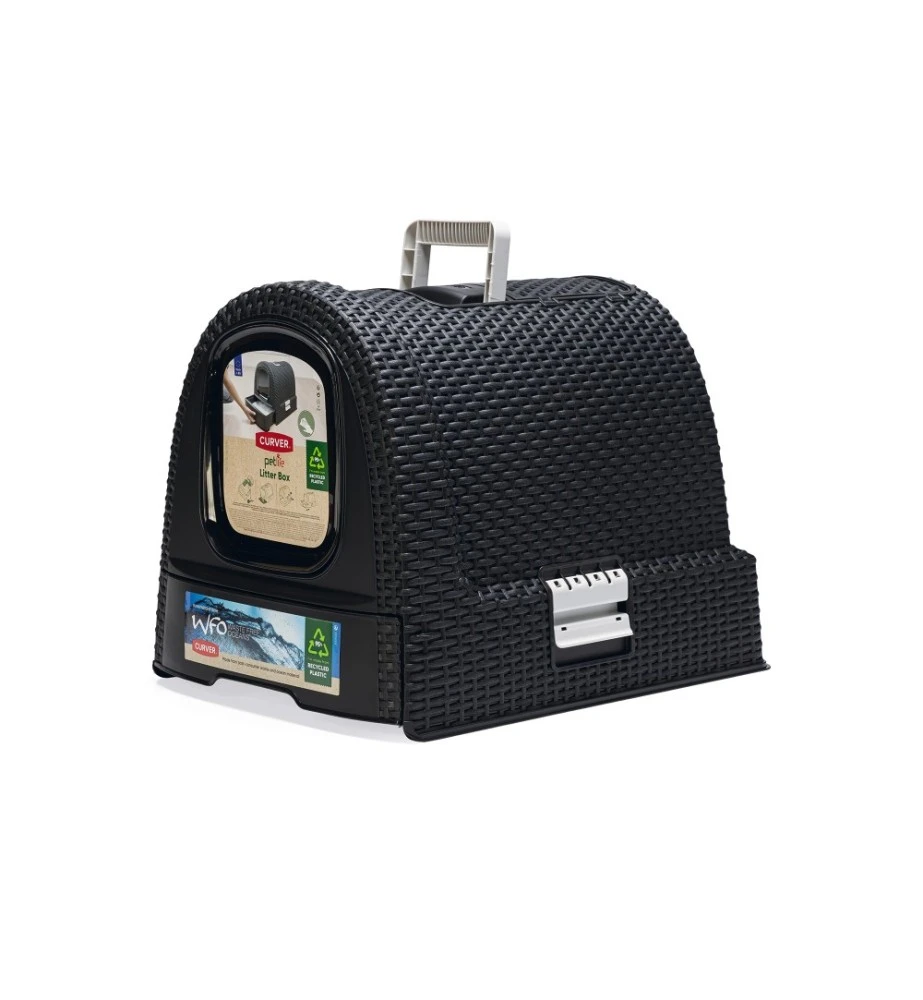 De Curver kattenbak heeft een modieuze uitstraling doordat het een motief heeft van gevlochten rattan. De lade aan de voorkant heeft een plateau met gaatjes, waardoor de kat een groot deel van het kattenbakgrit achterlaat in de bak alvorens de kattenbak te verlaten. Door de uitschuifbare lade kan je in een oogopslag zien of de kattenbak aan verschoning toe is. Aan de bovenkant van de kattenbak bevindt zich een klepje waar de kattenbakschep opgeborgen kan worden.