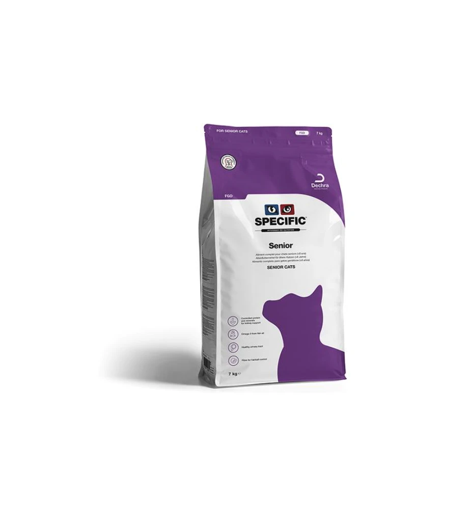 Specific Senior FGD is een complete en uitgebalanceerde onderhoudsvoeding voor oudere katten. Het bevat voedingsstoffen die de hartfunctie, leverfunctie, nierfunctie en de gewrichten ondersteunen. De toegevoegde Omega-3 vetzuren zorgen voor een gezonde vacht en huid en ook voor soepele gewrichten.